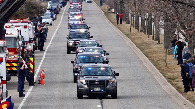 Red and blue lights flashed along a parkway as dozens of officers from Boulder and neighboring departments stood at attention. When the hearse passed, the officers saluted as one shouted, “Attention!” One person held an American flag.